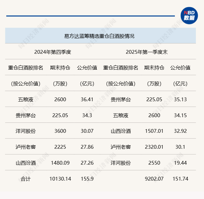 易方达蓝筹精选混合较上一季度减持928.07万股,持仓市值减少4.16亿元;景顺长城新型成长混合白酒股减持91.03万股,持仓市值较上一季度减少0.46亿元至93.42亿元。