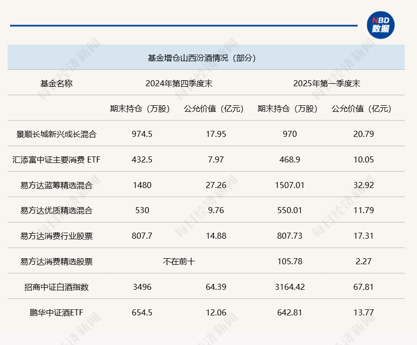 但市场也出现新的变化:山西汾酒凭借一季度28只基金“第一重仓”的表现,成为最大增仓亮点。易方达蓝筹精选混合、汇添富中证主要消费ETF等机构分别增持了5.66亿元、2.08亿元。