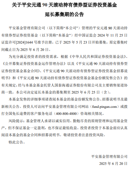 公告称,平安元通90天滚动持有债券基金于2025年5月23日开始募集,原定认购截止日为2025年6月20日,现决定延长至2025年6月25日(含)。