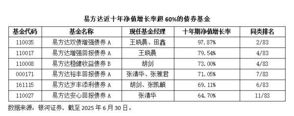 从具体产品来看,银河证券数据显示,截至6月30日,易方达旗下共有10只主动管理的债券基金近十年净值增长率超50%。其中,由王晓晨、田鑫共同管理的易方达双债增强债券(A类:110035)净值增长率97.87%,在83只同类产品中位居第2;另有3只债券基金近十年净值增长率超70%,分别为王晓晨管理的易方达增强回报债券(A类:110017)、胡剑管理的易方达稳健收益债券(B类:110008)以及张清华、张雅君共同管理的易方达裕丰回报债券(A类:000171)。
