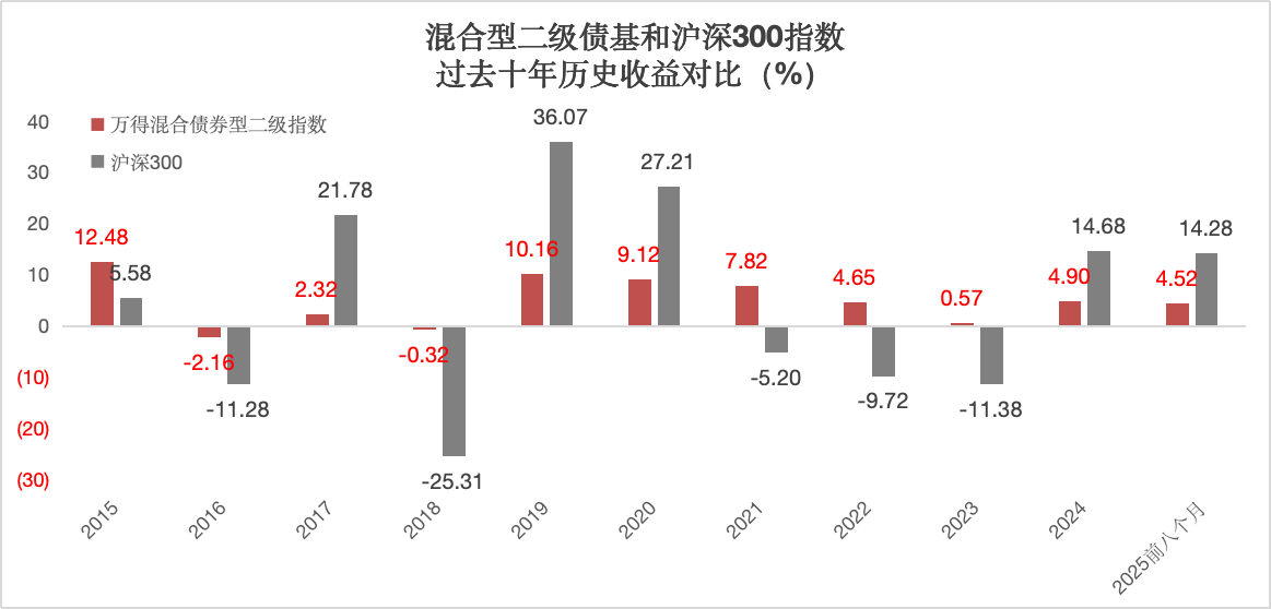 据Wind数据,从2015年1月1日至2025年8月31日,混合债券型二级基金指数累计上涨52.28%,而同期沪深300指数涨幅为27.25%。2024年以及2025年前八个月,混合债券型二级基金指数分别上涨4.90%、4.52%;2024年以来累计涨幅达9.65%。
