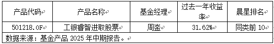 2、工银睿智进取股票A成立于2021年11月24日,基金经理周崟自2025年4月1日起担任该产品基金经理。该产品今年以来、过去一年及2022-2024年度净值增长率分别为:14.88%、31.62%、0.36%、-13.57%、6.21%;同期业绩比较基准为:0.96%、14.39%、0.76%、-8.89%、11.99%。数据来源:基金产品2025年中期报告及各年度年报。