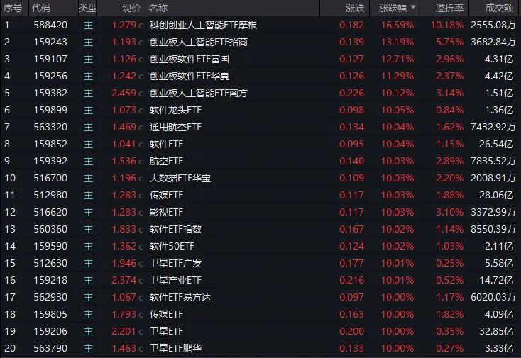 板块层面,传媒、软件、航天军工全线飙升,带动股票型ETF罕见“涨停潮”。数据显示,科创创业人工智能ETF摩根单日暴涨16.59%,领跑全市场;另有2只创业板人工智能ETF和2只创业板软件ETF涨幅均超10%。