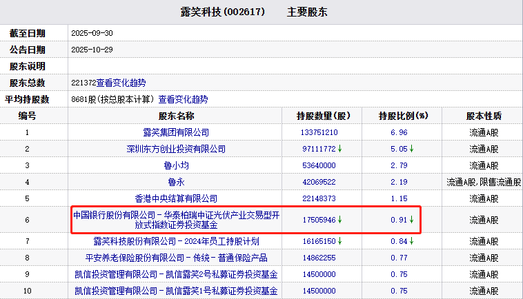 2025年三季报显示,华泰柏瑞中证光伏产业交易型开放式指数证券投资基金持有露笑科技1750.59万股,占其流通股比例的0.93%,为第6大流通股东。