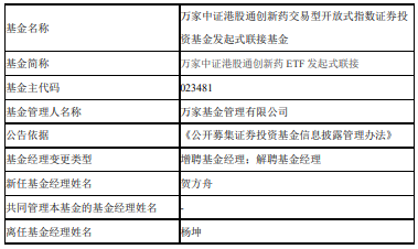 中国经济网北京330日讯 近日,万家基金公告,万家中证港股通创新药ETF发起式联接增聘贺方舟,杨坤离任。