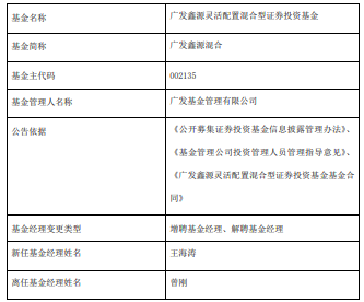 中国经济网北京4月1日讯 今日,广发基金公告,广发鑫源混合增聘王海涛,曾刚离任。
