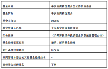 中国经济网北京4月2日讯 今日,平安基金公告,平安消费精选混合增聘区少萍,丁琳离任。