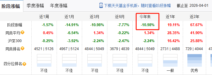 从此前披露的2025年4季报看,该基金前十大重仓股为中国国航、中国南方航空、中国东方航空、阿里巴巴、天顺风能、中远海能、蒙牛乳业、腾讯控股、李宁、快手。尽管其风格是传统低估与互联网龙头分散布局,但截至今年4月1日,其在今年内的收益率同样下跌了10.98%,位居5049只有可比业绩的第4844名。