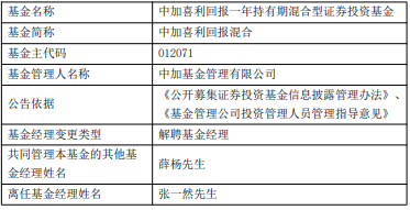 张一然离任中加喜利回报混合