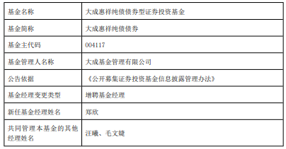 中国经济网北京4月7日讯 近日,大成基金公告,大成惠祥纯债债券增聘郑欣。