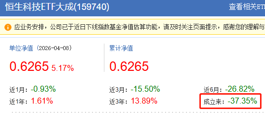 资料显示,恒生科技ETF大成成立于2021年5月18日,截至2026年4月8日,其累计收益率为-37.35%,累计净值为0.6265元。而从规模看,其截至去年底的管理规模高达189.75亿元。