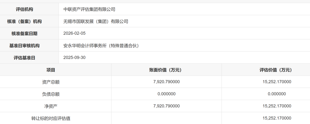 交易信息披露,截至2025年9月末,国联民生对中海基金长期股权投资的账面金额为7920.79万元,经评估,该部分股权评估值达15252.17万元,评估增值7331.38万元,增值率高达92.56%。