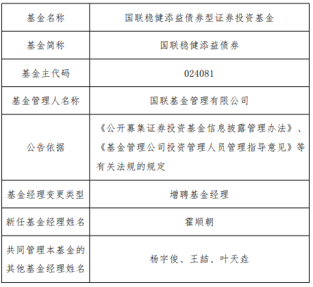 中国经济网北京4月10日讯 今日,国联基金公告,国联稳健添益债券增聘霍顺朝。