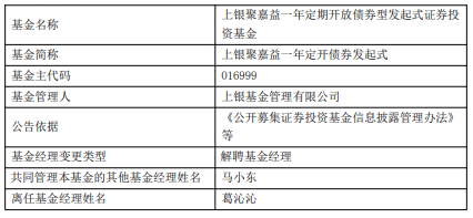 葛沁沁离任上银聚嘉益一年定开债 马小东管理