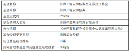 中国经济网北京4月13日讯 近日,前海开源基金公告,前海开源安和债券增聘田维。