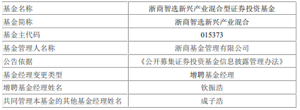中国经济网北京4月16日讯 今日,浙商基金公告,浙商智选新兴产业混合、浙商智选经济动能混合增聘钦振浩。