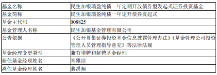 民生加银瑞盈纯债一年定开债增聘郑雅洁 裴禹翔离任