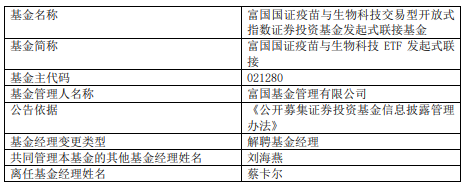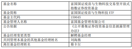 中国经济网北京4月16日讯 今日,富国基金公告,蔡卡尔离任富国国证疫苗与生物科技ETF、富国国证疫苗与生物科技ETF发起式联接。