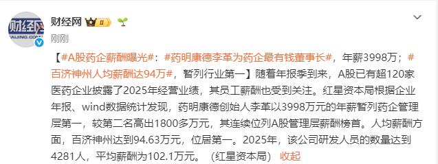 4月16日,据财经网,随着年报季到来,A股已有超120家医药企业披露了2025年经营业绩,其员工薪酬也受到关注。